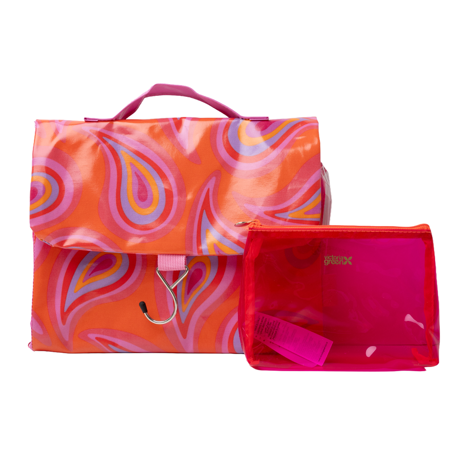 Keep your toiletries beautifully organised with our stylish Threefold Hanging Wash Bag in the Groovy Paisley print. This vibrant design features a playful paisley motif in pastel magenta and lavender tones, accented with bold orange details that guarantee you’ll never leave it behind in a hotel bathroom. Perfect for adding a splash of colour and personality to your travel essentials and it pairs perfectly with our clear make-up bags for a coordinated look.