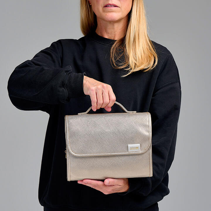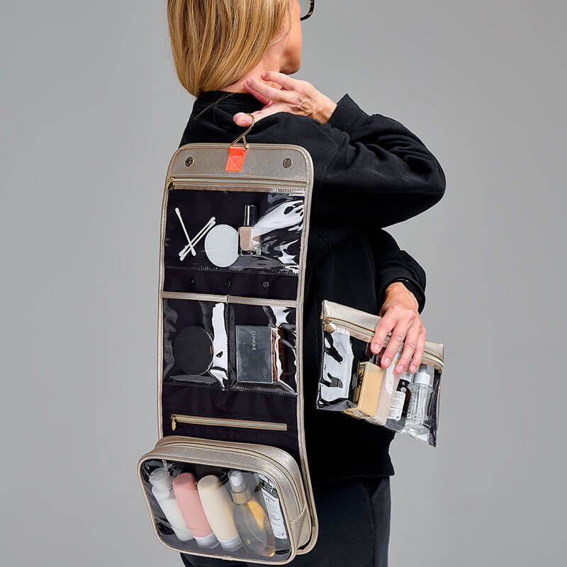 The original 3 in 1 travel hanging wash bag in a luxe gold vegan leather.