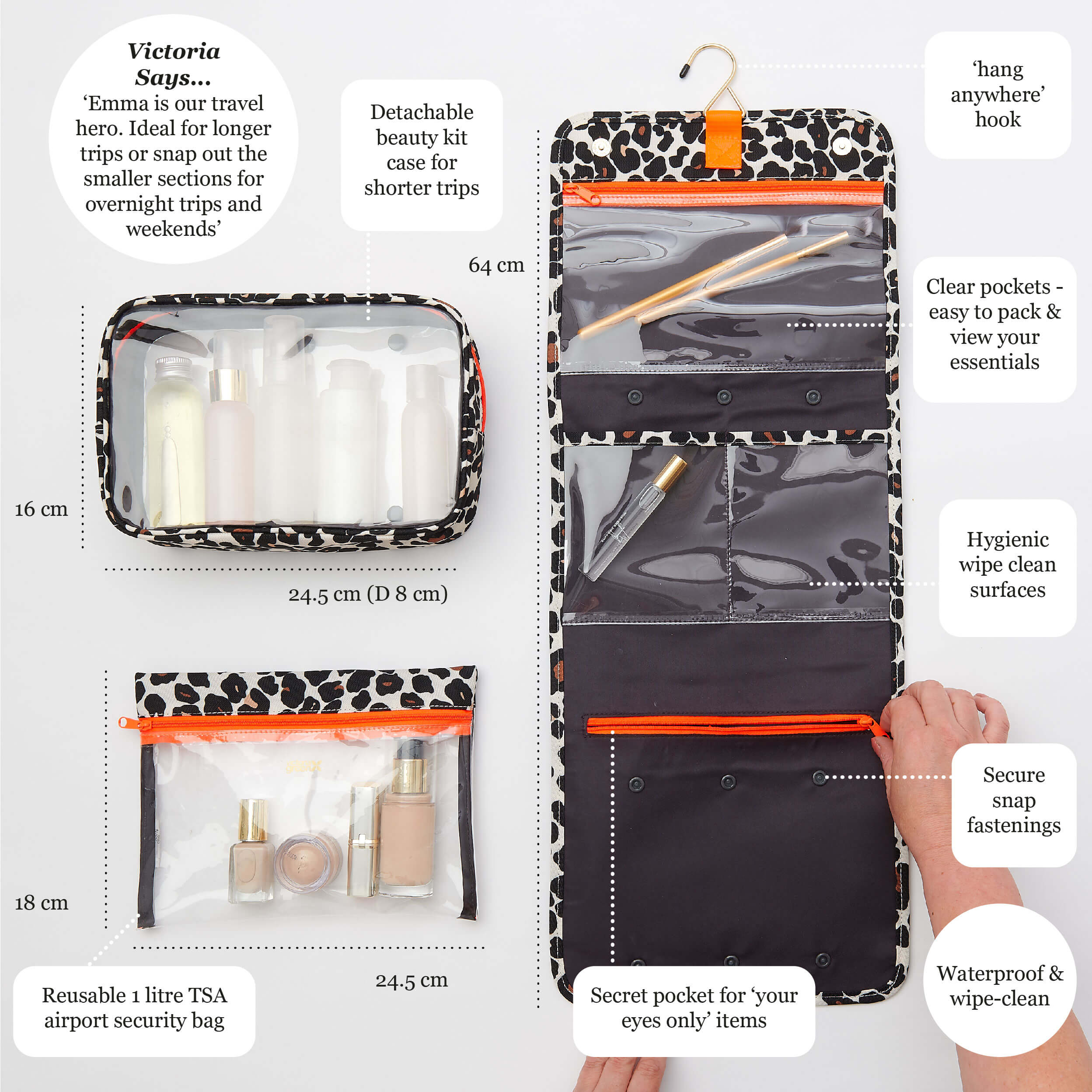 This best selling hanging wash bag has been updated with a bold tan leopard print pattern and is complimented with pops of neon orange on the trims and interior linings.
