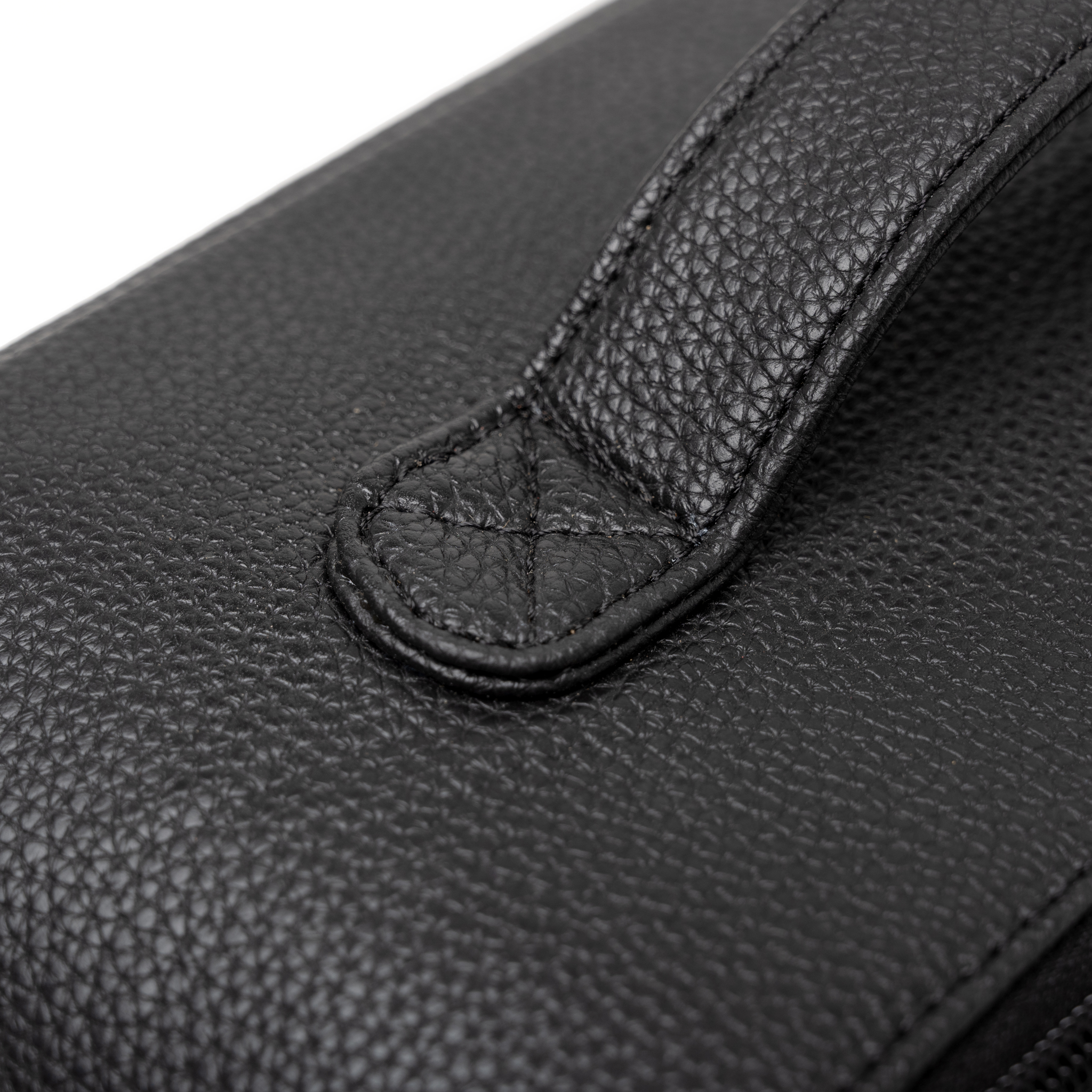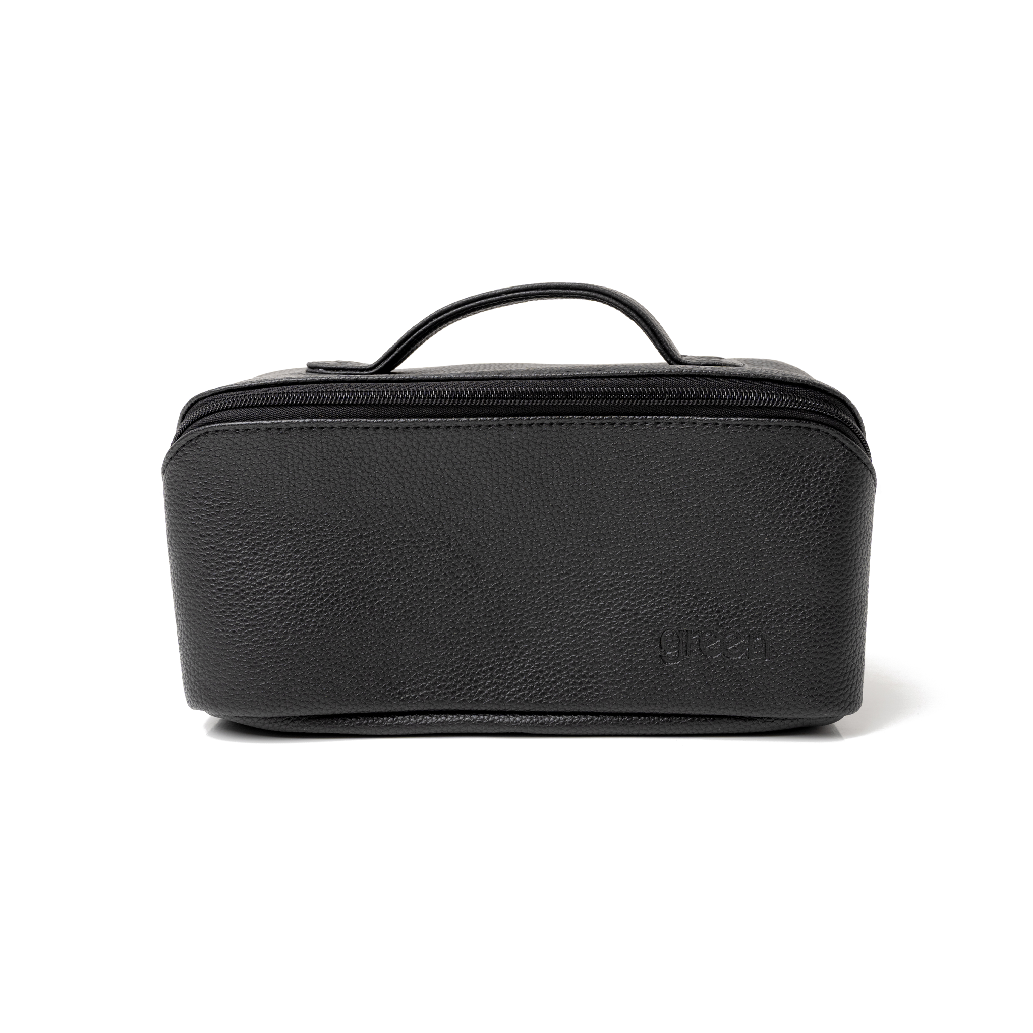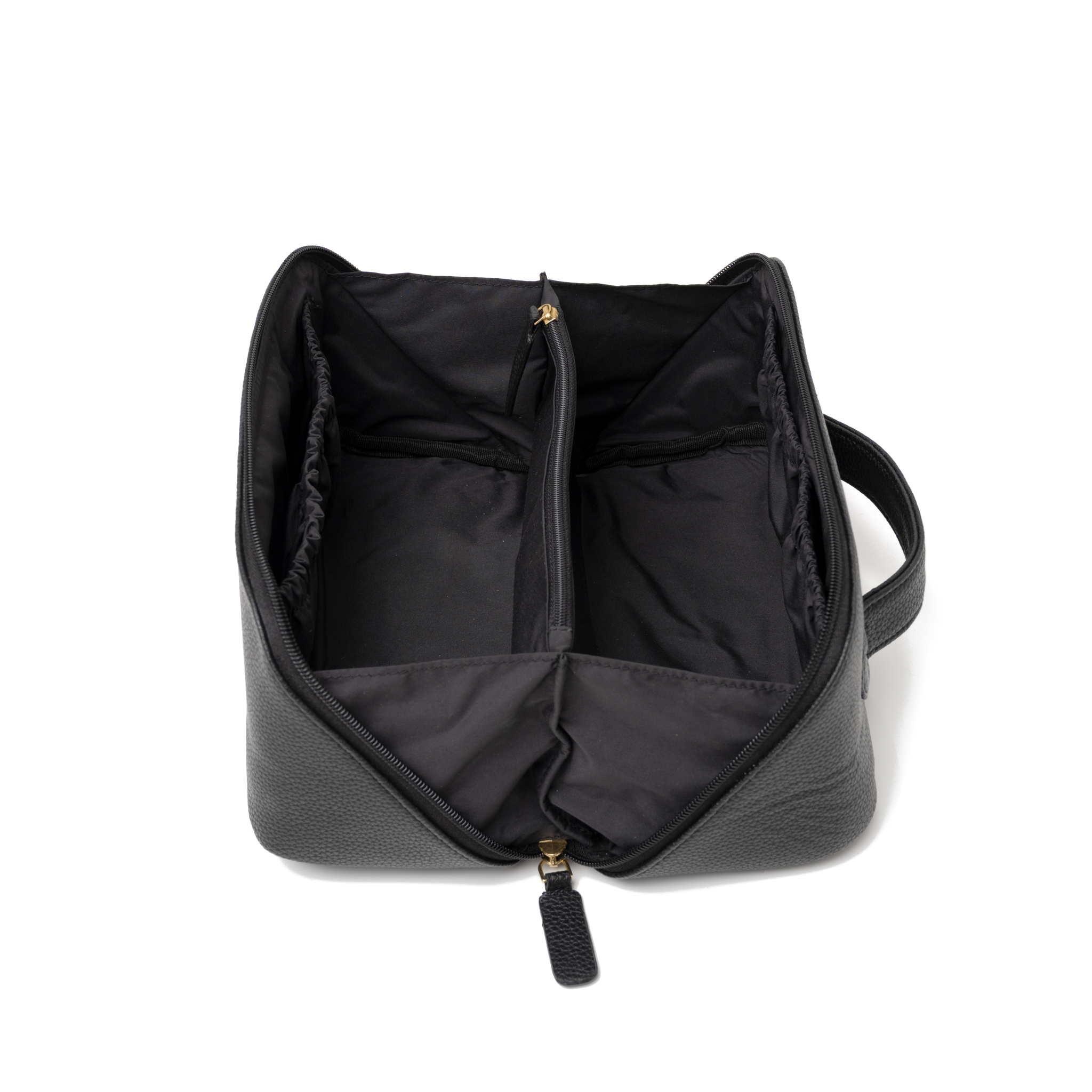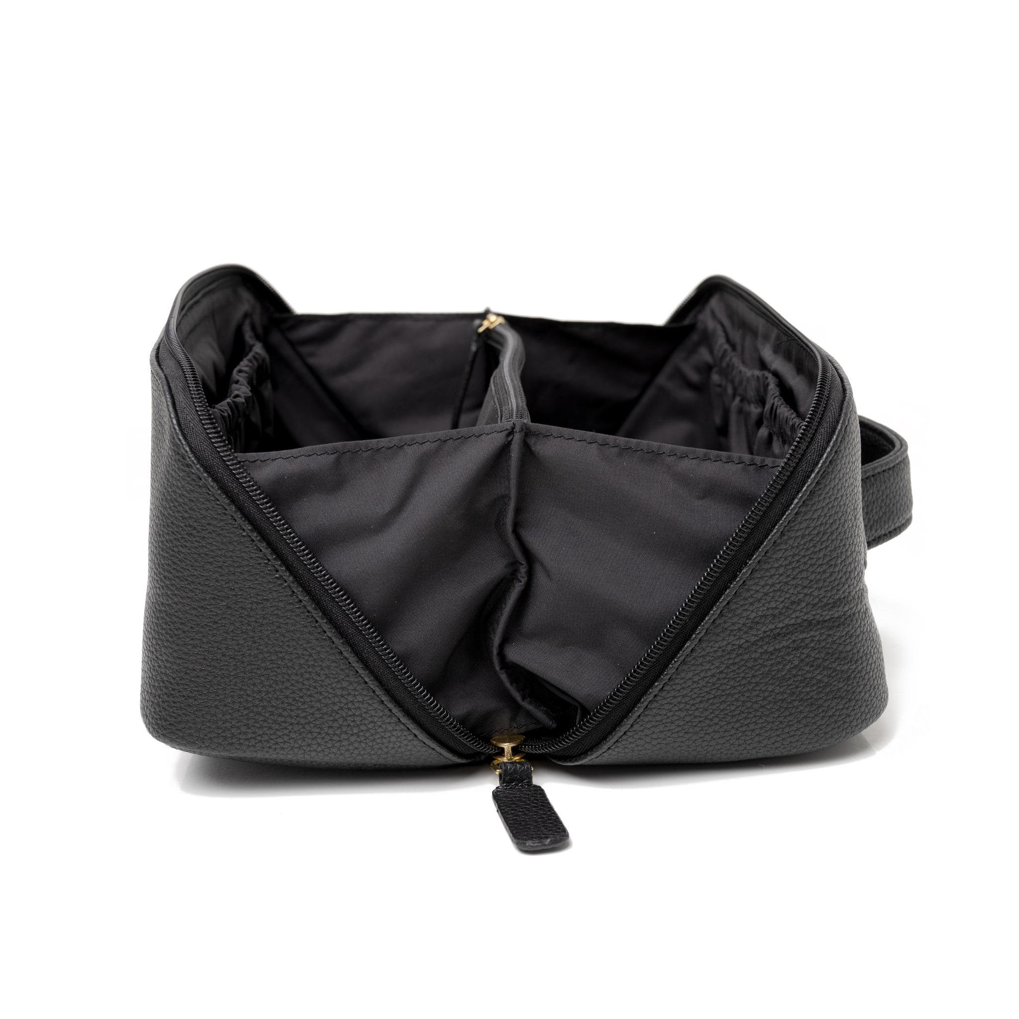 Made from recycled vegan leather, this fold-out makeup bag in classic matte black is designed to unzip and lay completely flat, offering full visibility and ease of access to your essentials. A central zip pocket and 3 side elasticated pockets keep contents secure and beautifully organised.